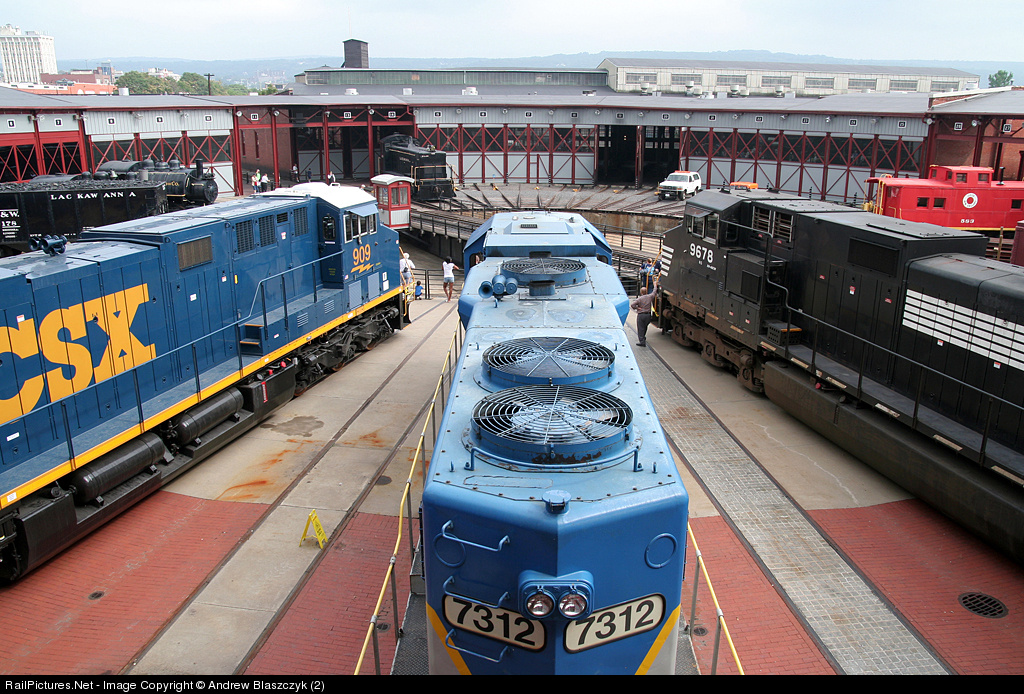 | Three Class I railroads are represented by diesel power at Steamtown's Lackawanna Railfest: CSX ES44AC 909, CP (ex-D&H) GP38-2 7312 and a rather dirty NS Dash-9 9678. |