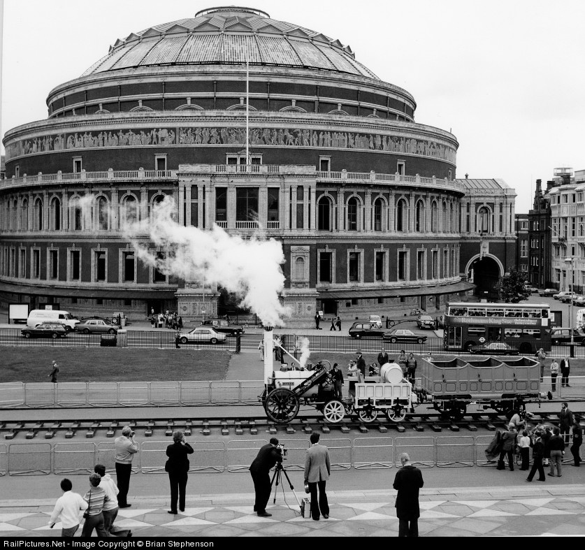 | The replica of Stephenson's 'Rocket' is filmed by the media in Kensington Gardens opposite the Royal Albert Hall during its first public outing before the Rainhill 150 celebrations the following year. |