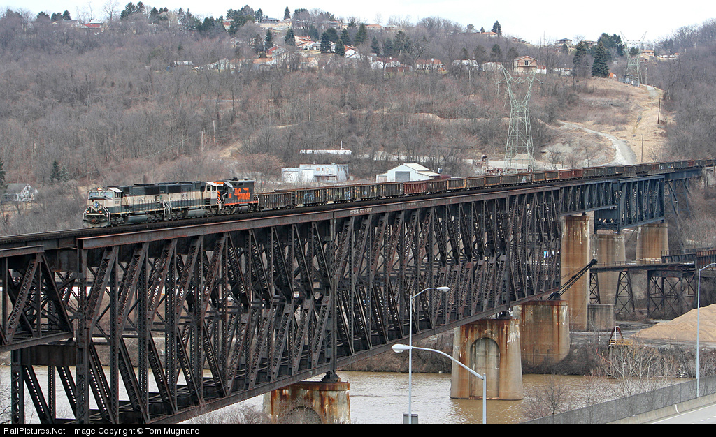 BNSF power on the last slab train over the W&LE massive Speers Trestle that sits above the Monongahela River next to Interstate 70