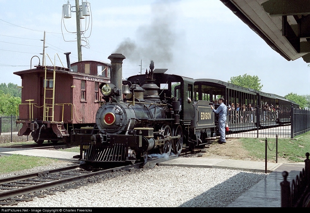 All aboard at Smith's Creek Depot! Weiser Railroad #1 is a replica Post-Civil War design American-style William Mason locomotive. It was built in 1932 at the Rouge Locomotive Shops in Detroit MI, from parts rescued from various locomotives. It is part of Henry Ford's Greenfield Village and is named for his friend, Thomas Edison. The village includes many famous homes from the industrial age, and was a pet project of Henry Ford's. The Weiser Railroad loops the 88-acre site, and at the time, shared this stop with Amtrak (whose trains ran outside the fence behind the caboose).