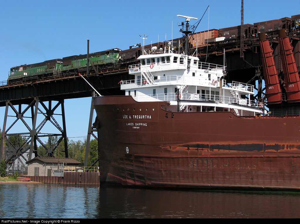 | A pair of Lake Superior & Ishpeming U30C locomotives shove ore jennies on the dock above the Lee A. Tregurtha - originally the USS Chiwawa (AO-68), launched in 1942 as a fleet tanker for World War II. |