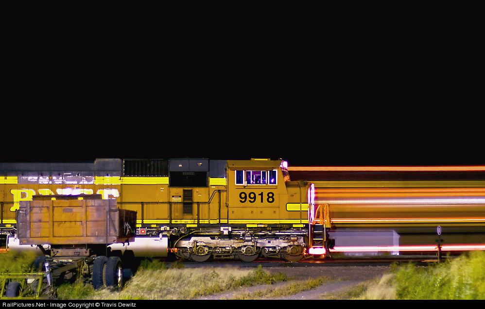 Note how the striping, lights, and colors of the passing train line up with the stationary locomotive. BNSF 9918 waits for it's turn to the Powder River Basin as a loaded coal train passes.
