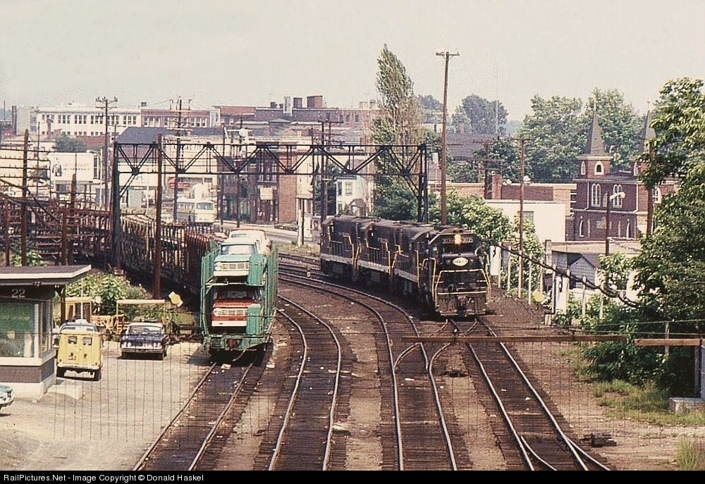NYC second generation power heads into Nevins to pick up freight consist.. Brand new 1966 Dodge trucks on the left in the autoracks are probably all gone by now. In secret board rooms PRR and NYC are plotting a major merger that will put to death the Keys