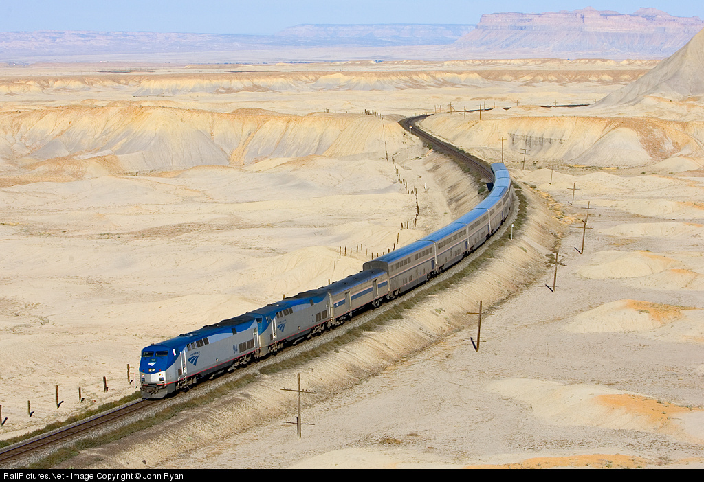 | Looking more like Mars than Earth, the eastbound California Zephyr skirts the Book Cliffs in eastern Utah. This is likely one of the most difficult spots I've ever shot. Click here for a shot of the westbound Zephyr at sunset at the same location. |