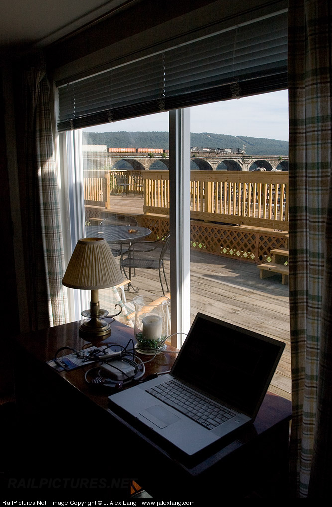 An eastbound pulls out of Enola Yard and onto Rockville Bridge as I relax and enjoy the view from the Lehigh Room of the