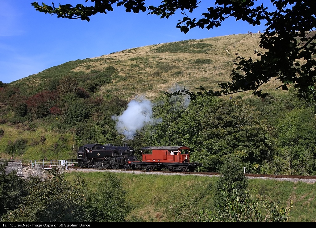 | British Railways Standard Class 4 2-6-4 Tank 80104 leaving Corfe Castle on the preserved Swanage Railway bound for Norden hauling an ex Southern Railway "Queen Mary" bogie brake van |