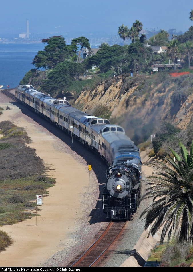 | ATSF 4-8-4 3751 leads the 24 car American Association of Private Rail Car Owners (AAPRCO) special southbound along the Pacific Ocean at Del Mar, CA on a beautiful Sunday morning. Click here to view a video of this scene. |
