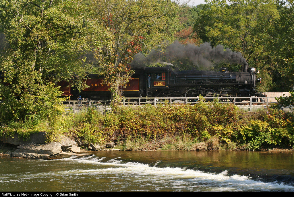 | Steam once again returns to the Cuyahoga Valley, thanks to the generosity of the Ohio Central. Here OC 1293 rubs shoulders with the humble Cuyahoga river through the village of Peninsula. |