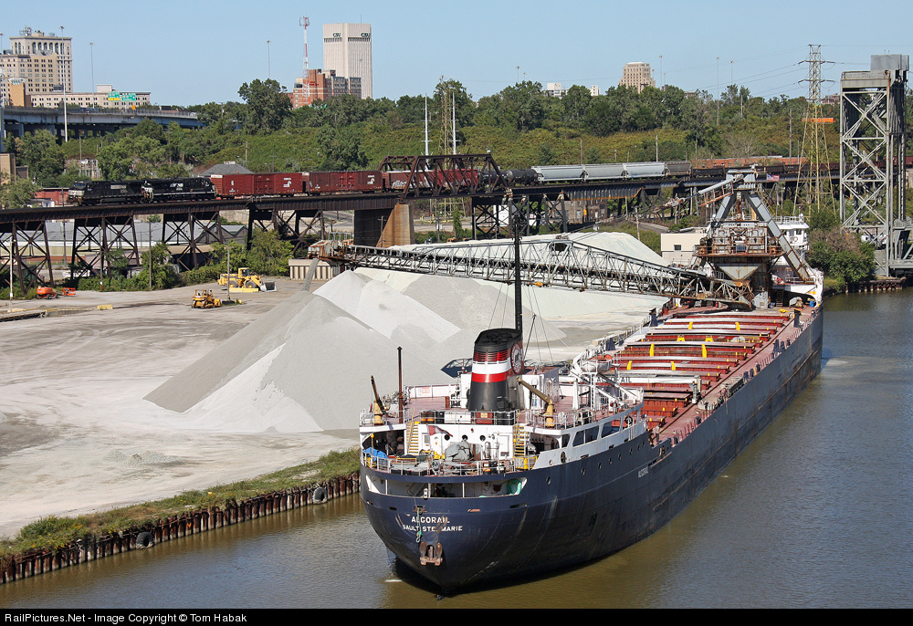 As 145 glides slowly across the Flats Viaduct, the freighter Algorail continues to unload its cargo of aggregate at Ontario Stone.