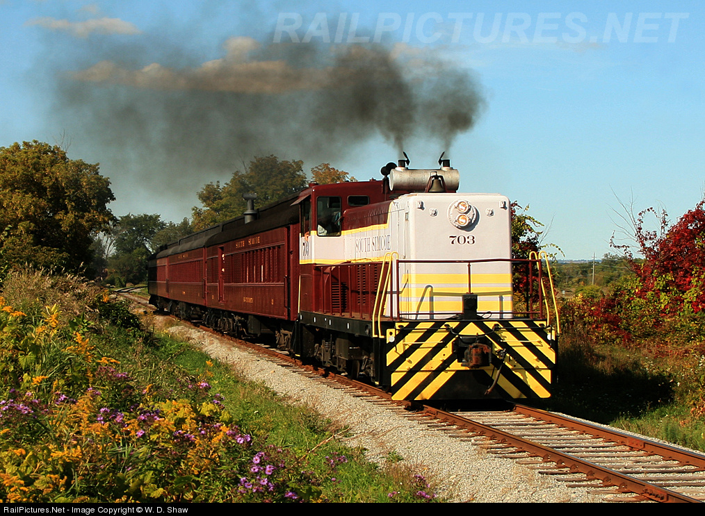 | I love this time of year! The emerging colors compliment any scene and when there's a train in it with matching colors, so much the better! Here SSR's 70-tonner hauls home the last excursion of the last day of summer. |
