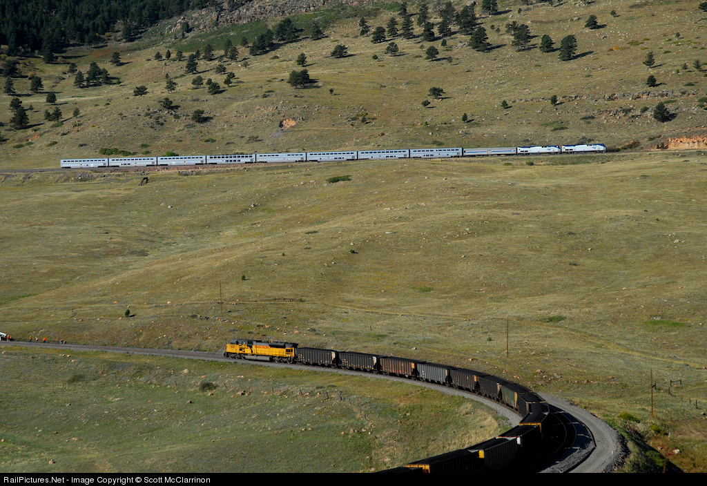 Amtrak's WB California Zephyr climbs past Clay siding as a UP loaded coal train restarts its journey downhill to Denver at Rocky siding. Both trains are roughly 1.5 to 2 miles apart at this point.