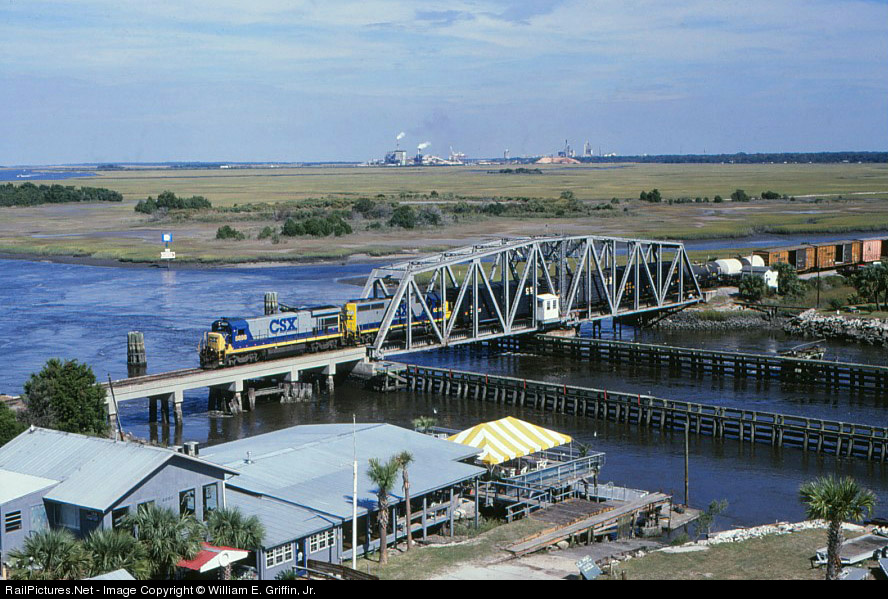 Crossing the intercoastal waterway, the CSXT train is on the former SAL's branch line from Yulee to Fernandina Beach. In the distance are the paper mills at Fernandina where the train originated. Since 2005, this line has been operated by the First Coast Railroad, a Genesee and Wyoming RR group short line.