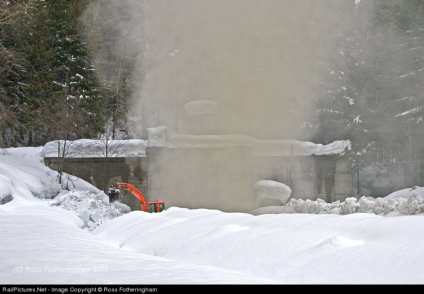 The tracks are down there somewhere. An almost unrecognizable West Portal of the Cascade Tunnel as BNSF goes into full-blown snow removal mode in early 2008 after an insane series of storms dumps snow measured in feet daily for about 8 weeks. With nowhere left to push the snow an emergency snow removal response & forecast team is set up in Skykomish WA and a second Jordan Spreader brought in from the mid-west is put on 24-hour duty. At Scenic BNSF hires contractors to help with D8 Cats, excavators and an 880 loader. Steve Carter and I snowshoe into this scene. Click Here to view my favorite shot from this deep winter!