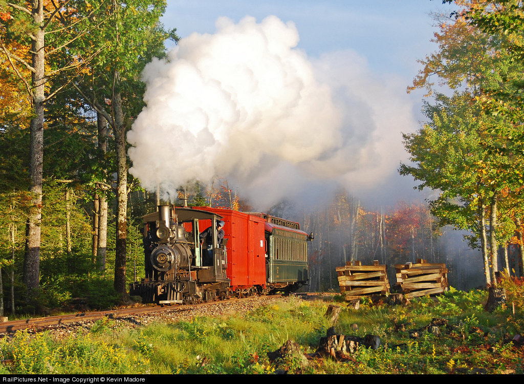 | If you ever wondered what fall in New England might have looked like when steam ruled the rails, you need to visit the Wiscasset, Waterville & Farmington Railway Museum in October. This railroad is a time warp in the woods of Maine. This shot of an authentic mixed train was taken very near the current north end of the line. In evidence are piles of railroad ties which have been positioned for an upcoming work weekend in which the museum will extend the line another 1200 ft. |