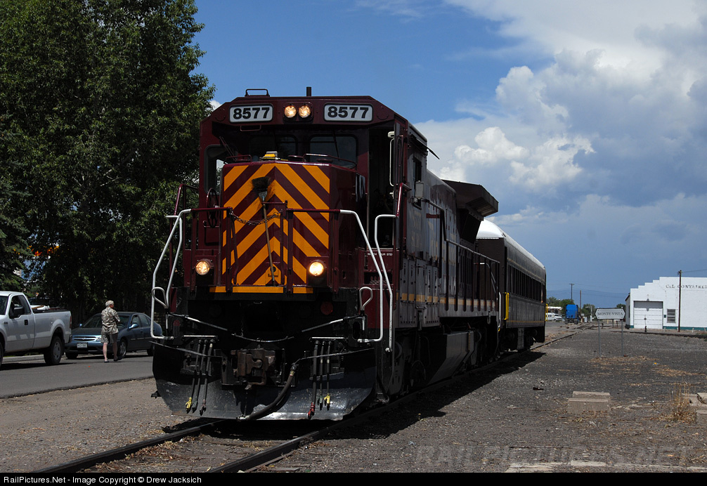 | Sunday morning in Monte Vista, Colorado as San Luis & Rio Grande #8577 is ready to take its one car passenger train back across the San Luis Valley to Alamosa. At one time, this branch continued on to Creede. The track is still in, but Monte Vista is the operational end of the line. |