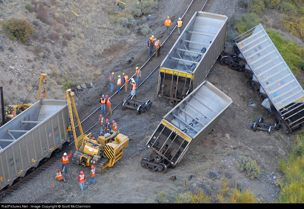 | Hulcher crews are busy cleaning up the aftermath of a derailment involving both UP and BNSF. Reports have a westbound BNSF rear ending a UP empty coal train between the Yarmony west switch and State Bridge, just outside of Bond. Special thanks to TME for the heads-up. |