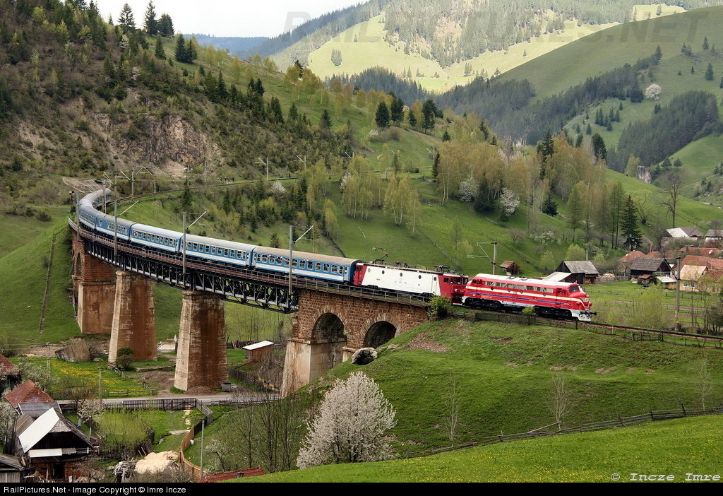 Special train from Hungary, pulled by a restored NOHAB-GM locomotive, and helped by a more powerful electric locomotive on the heavy grades of the line, is now descending towards Ghimes, where it's passengers will attend a ceremony.