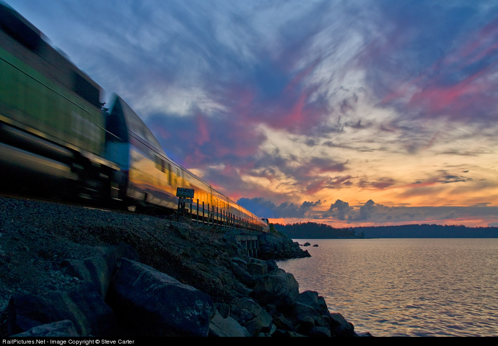 | Off into the sunset! Cascades 509 crosses the bridge at milepost 15.9, just south of the Steilacoom ferry dock, heading for it's next stop at Centennial Station in E. Olympia. BNSF 2089 is filling in for the usual F40 cabbage car. Click Here for a different view of this bridge earlier in the evening! |