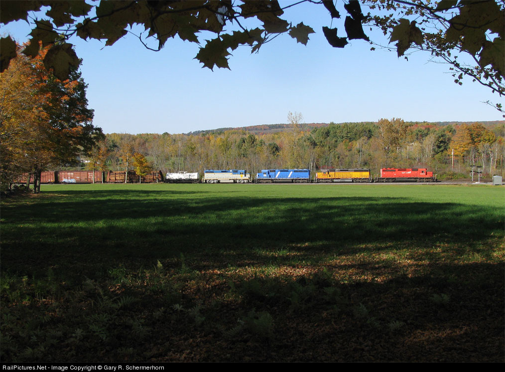 A very colorful CP 253 heads northeast past the serene grassy knoll at Gage Road near Delanson NY where it will hold briefly for a late running NS #939. Note trailing GP38-2 '7312'.