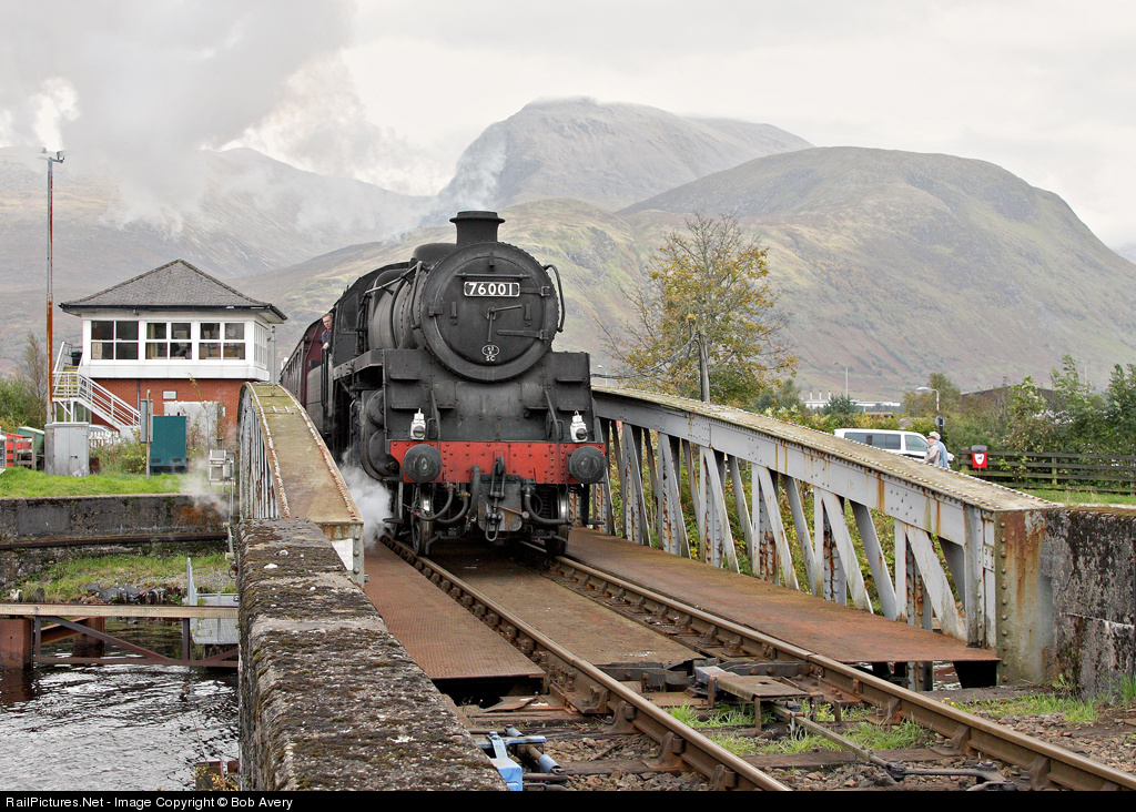 | 76079 (disguised as one time local engine 76001) crawls across Banavie Swing Bridge (over the Caledonian canal) with the afternoon photo charter to Mallaig. Behind the engine is Ben Nevis, Britain's highest mountain. The building is Banavie Signalling Centre, the focal point of West Highland operations. |