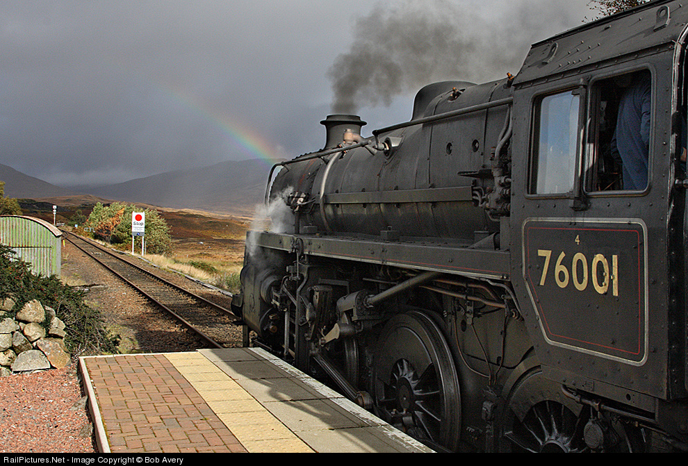 | 76079 (disguised as one time local engine 76001) pauses between showers at the isolated Rannoch station while working the annual West Highland Line photo charters. Rannoch's refreshment room does the best bacon sandwiches in Britain. |