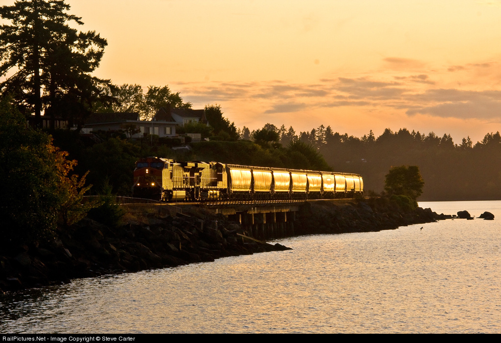 Right on time! A BNSF Grainer crosses a small inlet on the Puget Sound as a stunning sunset begins to form!