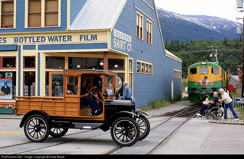 | A White Pass passenger train has returned from the summit and has pulled in to the downtown depot. The units have cut off and crossed State St. to the little tail at the very end of track so they can reverse diretion and run around their train. While lining the switch, a vintage automobile passes in a totally unstaged photo. Skagway truly is a time warp in the summer and a place every railfan should visit at least once. |