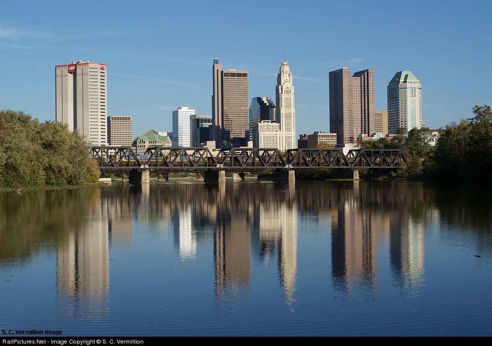 CSX westbound K train westbound crossing Scioto River with downtown Columbus rising in the background.