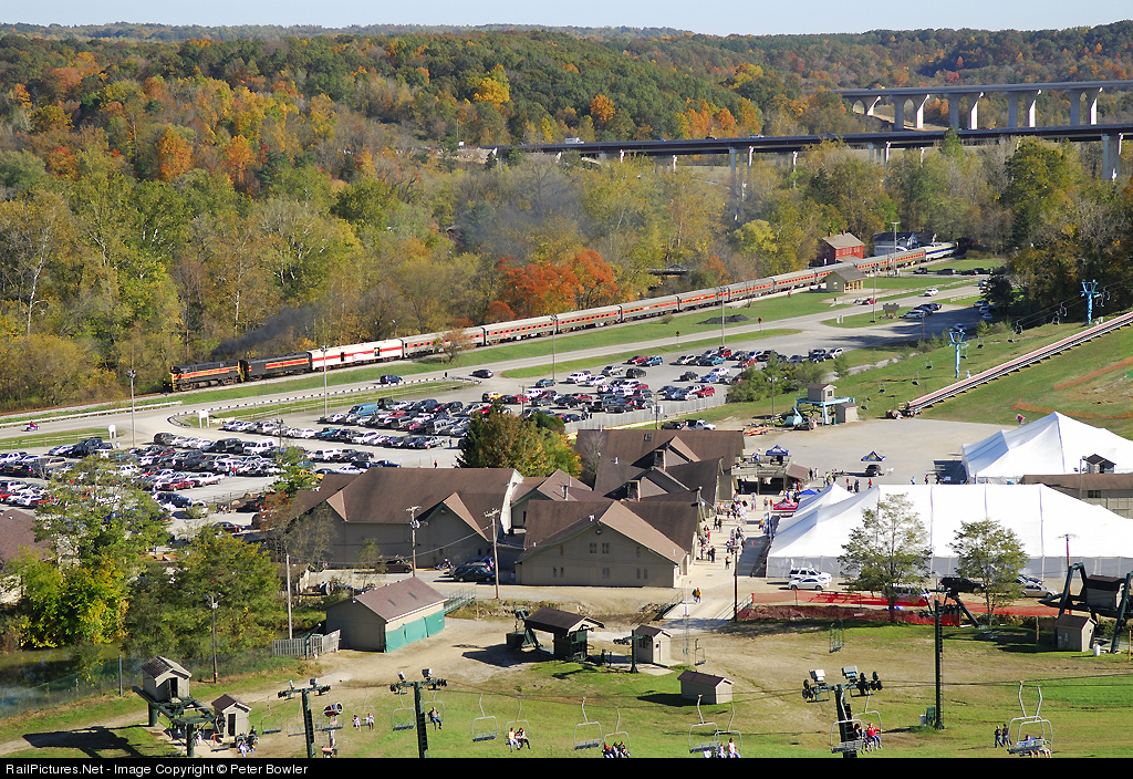 Cuyahoga Valley Scenic Railroad runs northbound in the National Park on a beautiful fall day with a long train of 12 passenger cars including a dome and the St. Lucie Sound observation car. In the distance are the Ohio Turnpike and I-271 bridges. In the foreground is Boston Mills Ski Resort.