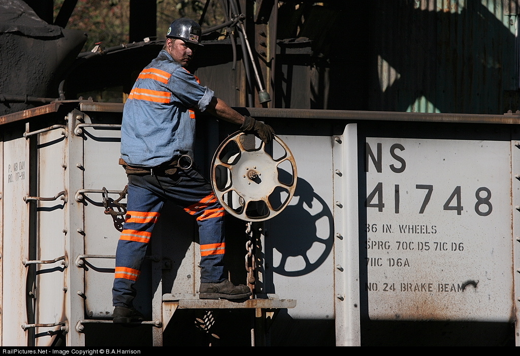 Bearing the coal dust of a hard days work and strapped in, a worker cautiously releases the brake allowing a Top Gon to roll downhill under the coal loadout. In this modern day it's hard to believe OSHA and all the other state and federal safety agencies allow such things. That being said, new track is currently being layed up the hollow for a new modern loadout and two coal silos, so this will be a thing of the past within a few months.