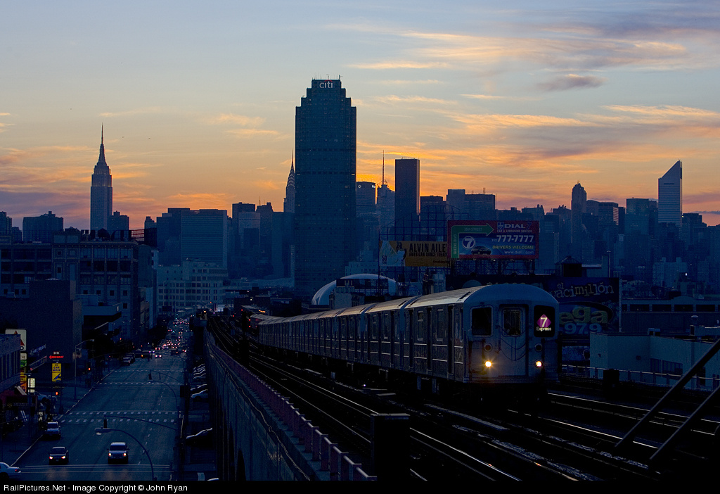 High on the viaduct above Queens Boulevard, a 7 Express train rolls towards Long Island with evening commuters. The sun has dipped below the horizon, and the evening lights are on. At least two of New York City's landmark skyscrapers are visible.