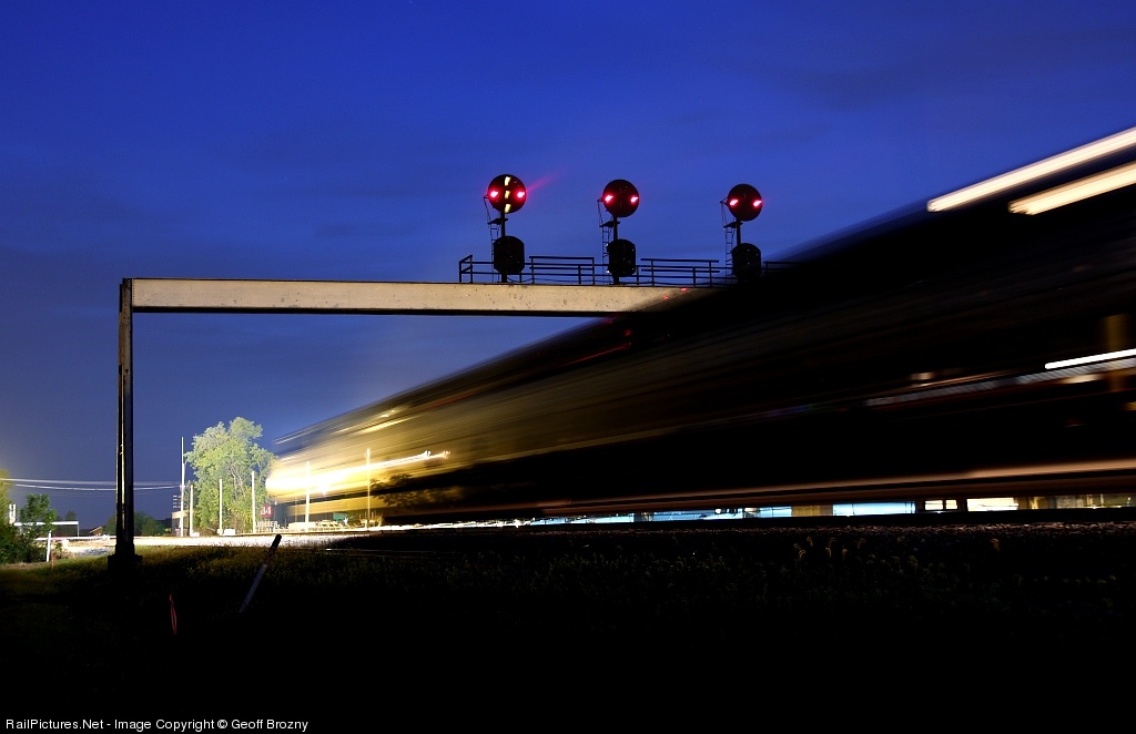 | NS 408 stops briefly for a crew change before taking the clear signal. Another PRR signal bridge can be seen in the background, lit by 408's lights. |