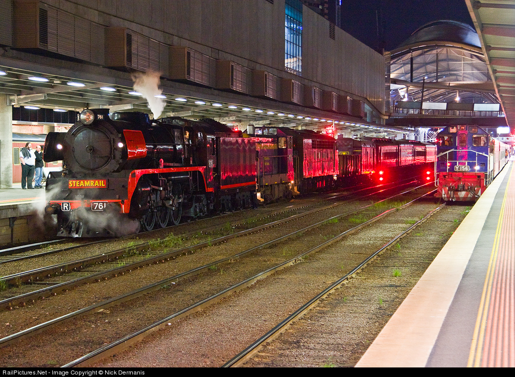 With yard pilot Y156 on the right of photo, R761 prepares to depart Melbourne Southern Cross station on a charter into a little country town named Wycheproof. Also in the consist are locomotives T356 and S301.