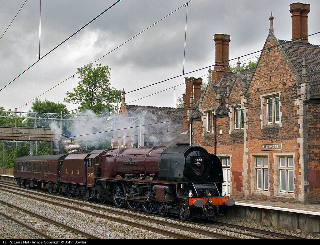 | LMS 6233 'Duchess of Sutherland', back on the West Coast Mainline, passes through Atherstone Station with support coach 99041 on the 5Z33 1324 Crewe - Southall, a locomotive positioning movement. An electronic jigsaw puzzle of this image is available as a free download here : http://www.train-puzzles.com/rp257717.html |