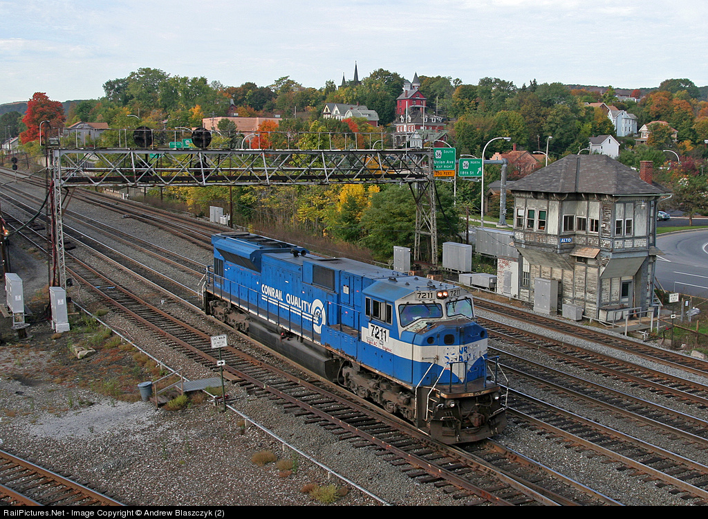 | The photographer could not help but to be reminded of Green Day's Boulevard of Broken Dreams as NS 7211 rolls under its own power towards the JLS after bringing 36A down off the hill. After getting some minor mechanical work done, the locomotive will emerge and be put back into service wearing a new coat of black paint leaving two NS 80MACs in Dress Blue. |