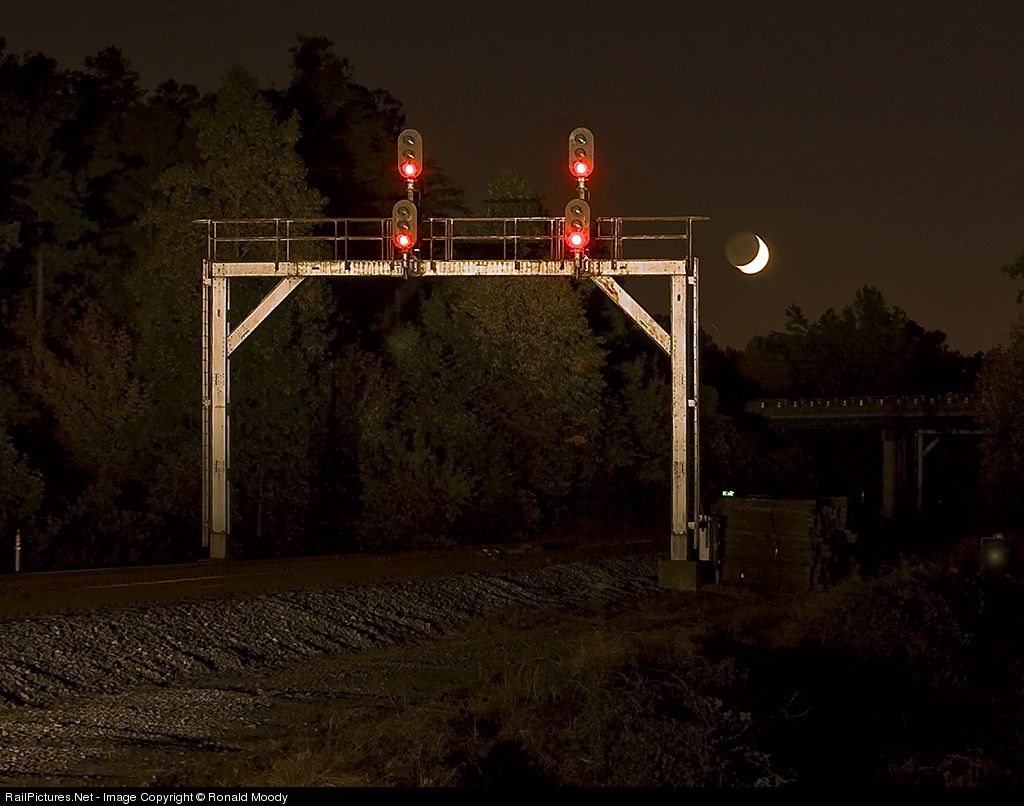 While taking a break from "Trick or Treating" with the kids, I noticed that the moon was in a really neat position and decided to capture the moment with my headlights set to "high-beam" to illuminate my favorite signal bridge in Mt. Airy, GA .