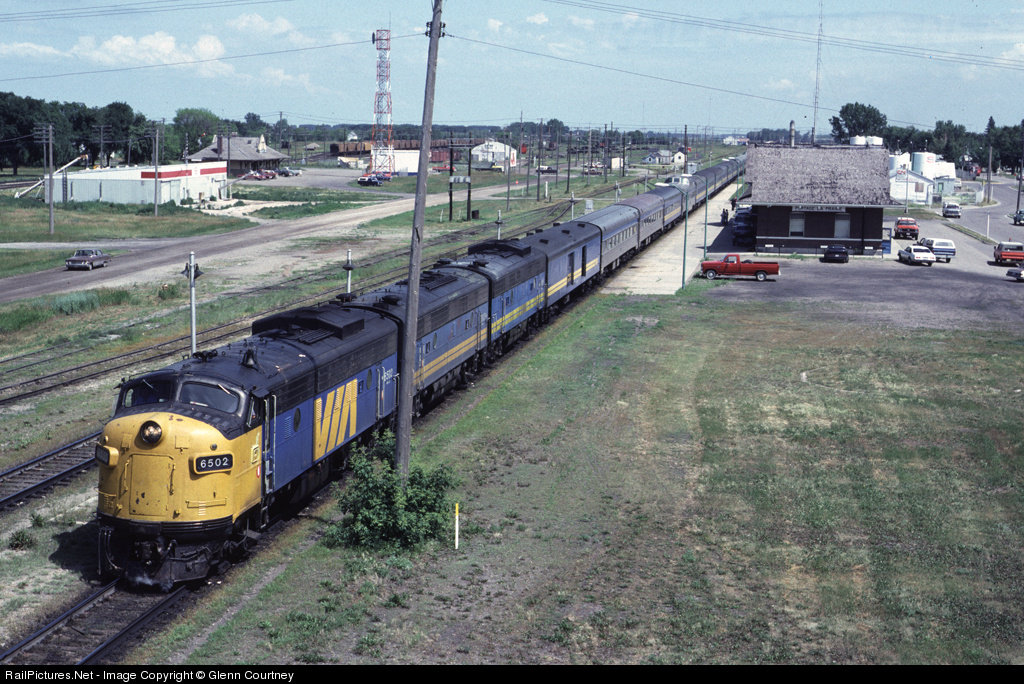 | While in Winnipeg with my father for the NMRA convention we ventured west to spend a day in downtown Portage la Prairie to catch the action on the parallel CN and CP main lines. At 1450 Via #1, behind a Via 6502, 6607 and 6602 made its station stop on its way west to Vancouver. |