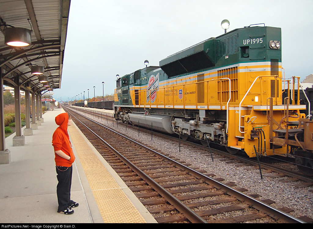 A young commuter watches UP 1995 depart Marion street with interest. Clearly the contrast of the CNW heritage unit's colorful paint scheme with the the darb and dirty UP power that normally parades through this station gets the attention even of non-railfans.
