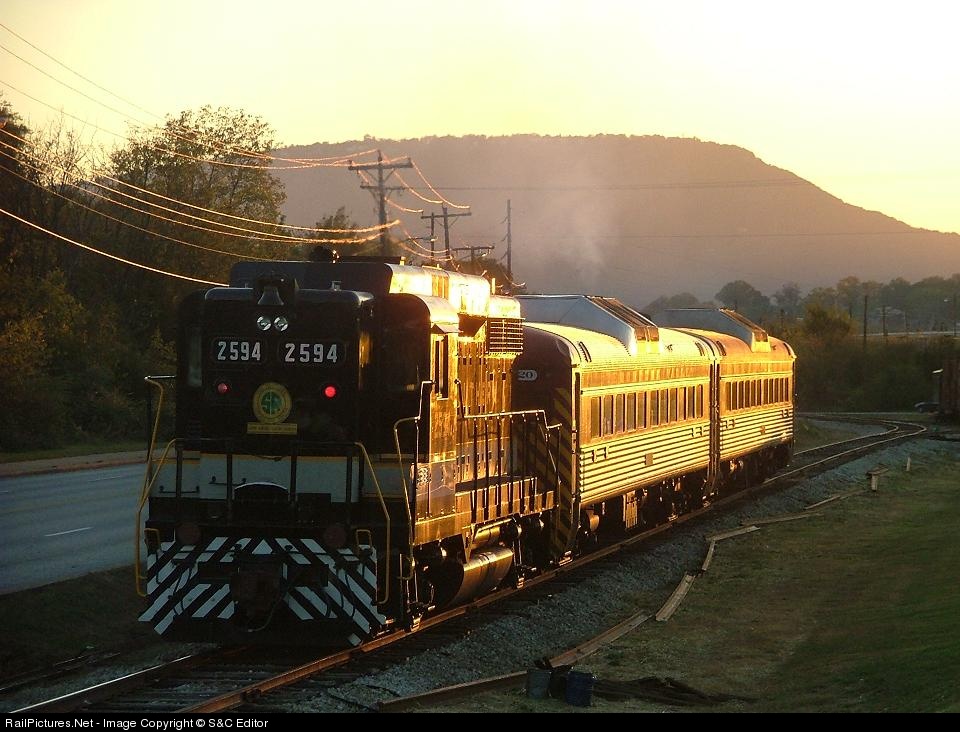 Southern 2594A is operating in push mode on TVRM's "Halloween Eerie Express" as the day's last sunlight glints off the stainless steel exterior of ex-B&O RDC cars. The forward motorman's compartment is being used as a cab control car. The glow of Lookout Mountain fills the background. SR 2594 belongs to the Southeastern Railway Museum, Atlanta Chapter NRHS.