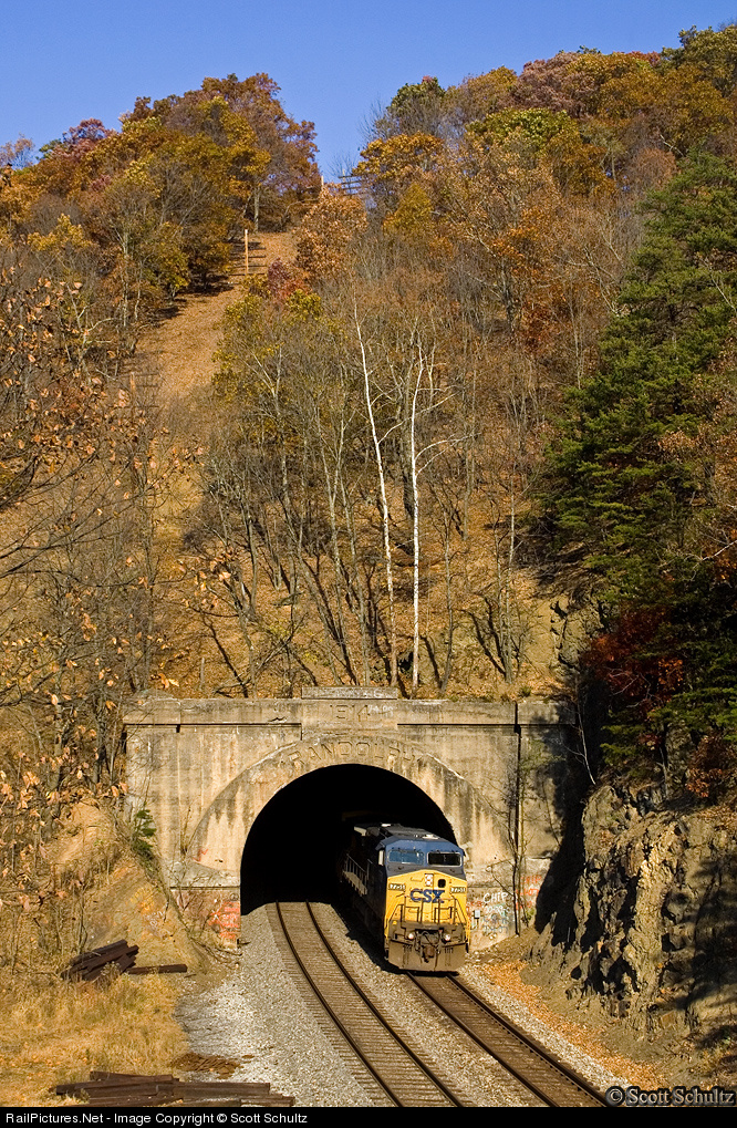 CSXT 7751 bursts out of Randolph Tunnel, leading autoracks west on track #2.