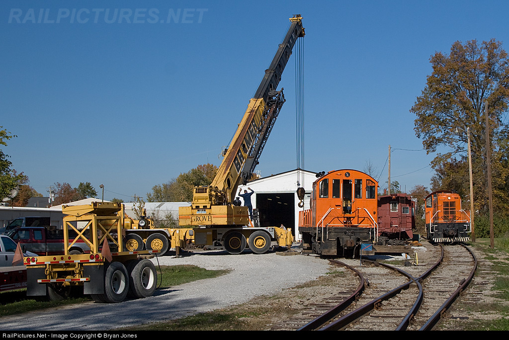| Southern Indiana RR has rented a large crane which was used to lift the front end of Alco S2m #103 to allow the front truck to be removed for work or traction motor replacement. Sister unit #104 sits on the "mainline" and was power for that days operations. Both units are powered by 660hp Cummins diesels. |