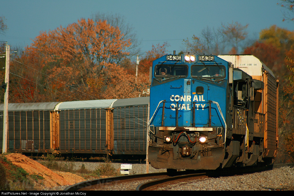 | NS 25N snakes its way west out of Bristol with a one of a kind lead unit. The lead unit, former CR 6259, was involved in a fatal three train collision at Effingham, Illinois in 1995 and was rebuilt with high numberboards instead of low numberboards like all other CR C40-8W's. |