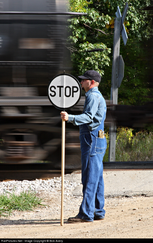 The loco is not visible, but a member of the crew flags the crossing at Baldwin Road during one of several runpasts at this location (featured elsewhere on RP). Part of a steam charter freight by SLST of UK.