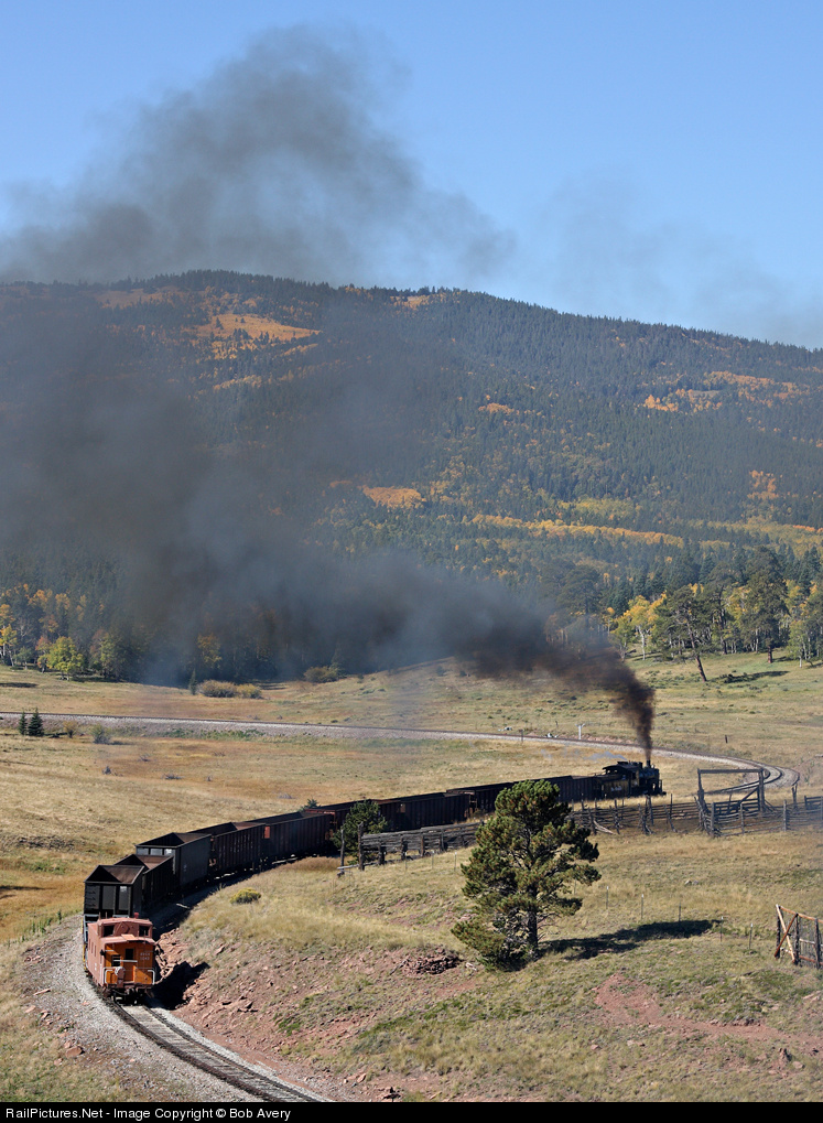 Ex LSI 2-8-0 #18 on the S-bend section of the horseshoe loop at Fir, on the magnificicent standard gauge La Veta Pass route. Photo freight for SLST group. Perfect light, power and scenery.