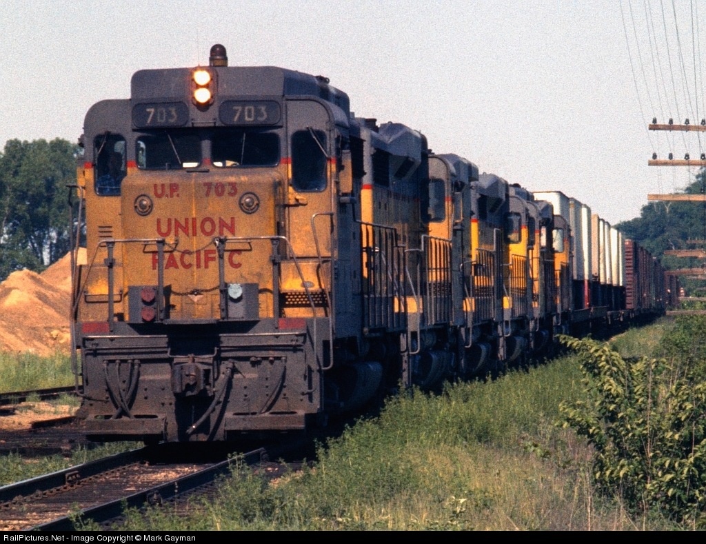 UP power pulling a westbound train on the IC. From a study of the track charts for the Iowa Division, Dubuque District, between Wood and Julien and from shots taken just before and after this one, I surmise that the location was near Millers crossing near Rockdale. The 703 looks like it needed a good wash. I'm no expert on EMD locos, but the 703 on the current roster, a GP38-2, is probably a replacement of the 703 here, judging by the superstructure. This was the first time I ever saw UP power on the IC--this apparently was common as the IC and UP were sharing power between North Platte and Chicago in that era. Nikon F with either a 135 or 350 mm lens.