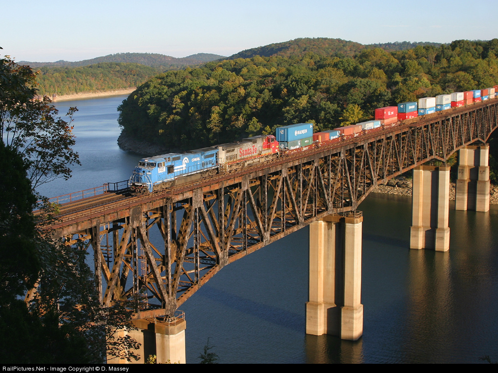 Two fallen flags lead a stack train across the Cumberland River on a clear fall afternoon.