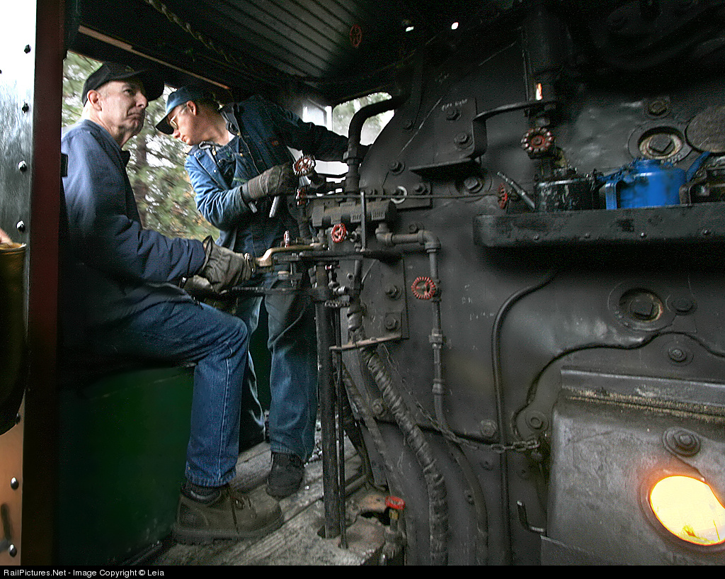 Excursion director Henry Luna taking the seat and assisting fireman Martin Hansen in getting #25 successfully up the hill on her last trip. The little prairie type engine was carrying a heavy load up a difficult incline, and doing so on wet tracks.