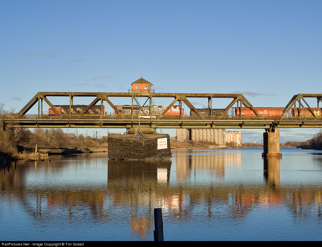During the last light of the day, CN 5302 crosses the James St. Swing Bridge over the Kaministiqua River enroute from Mission Island to Neebing Yard.