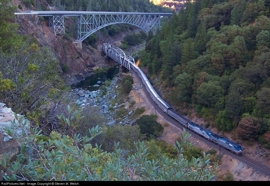 | Amtrak Train #5, the Westbound California Zephyr is detouring through the Feather River Canyon due to track work on Donner. It's seen passing one of the most scenic locations in the Canyon--- Pulga. |