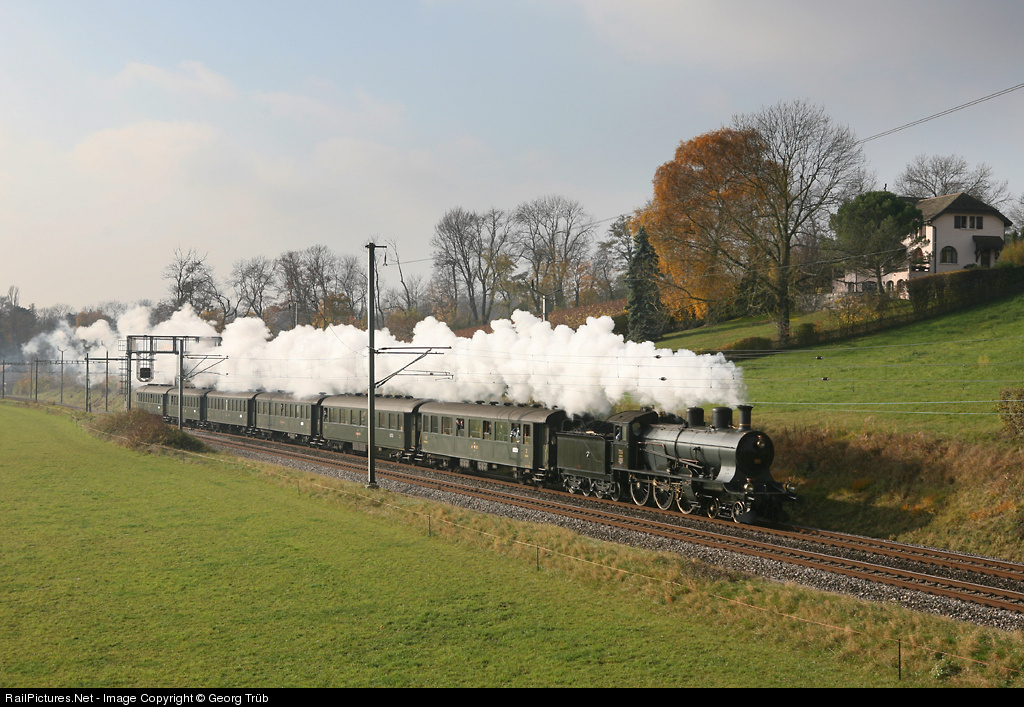 | For celebrating 150 years of the line Lausanne - Geneva, steamlocomotive A 3/5 705 with 6 vintage cars of the 1930' made two return journeys between this towns in the french speaking part of Switzerland. The elegant 4-6-0 fourcylinder-compound (de Glehn system) from 1904 has just passed the former station of Céligny and is racing towards Nyon. |